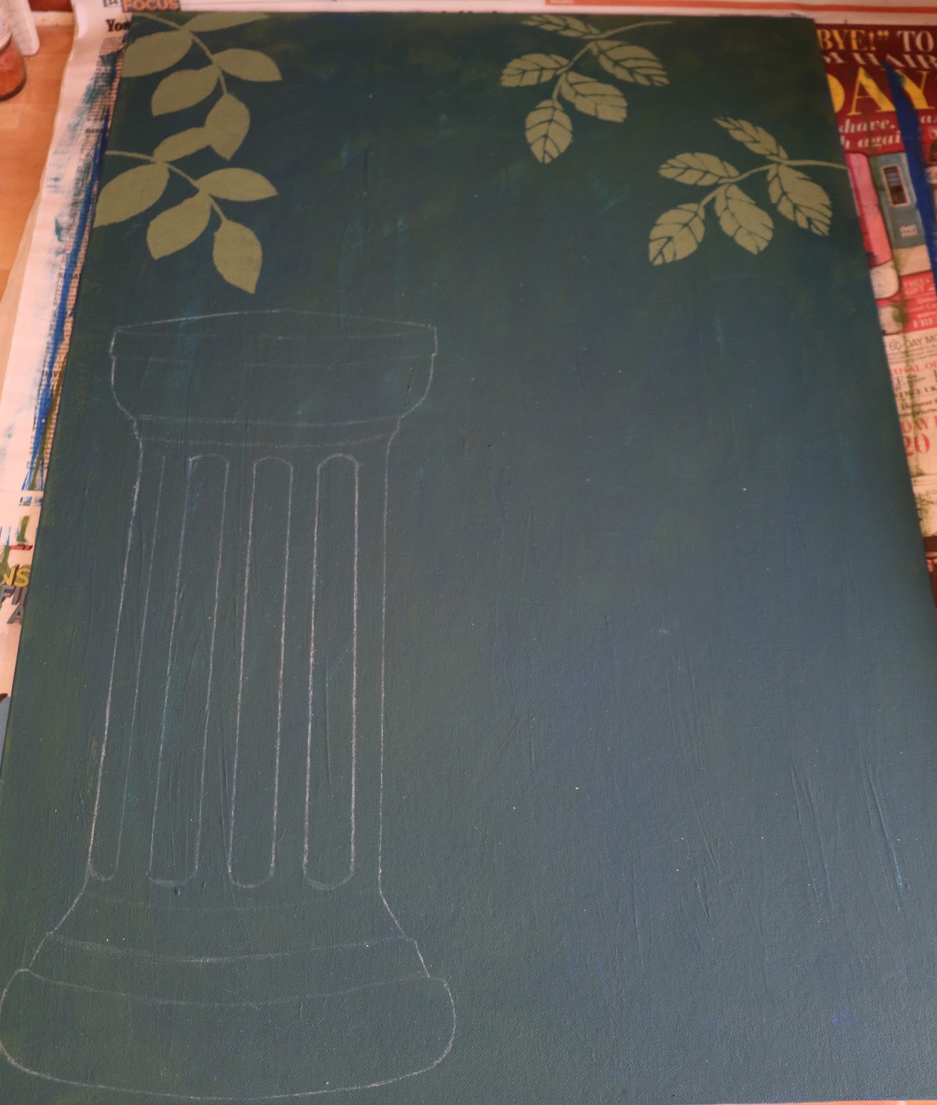 I decided to change my background to a teal colour by mixing together Pebeo Creme Paints Matt Navy Blue & Matt Fir Green. Once dry you can start stenciling on some leaves, I mixed a little Yellow to the Green to lighten the colour, here I used Sheena's Create a Flower Stencil Take Your Leaf. Using a White watercolor pencil I drew a column for the Peacock to sit on, other ideas were a wall, fence or bench.