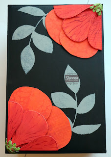 Instructions; Card base, white card stock A4 size folded in half to form A5 base card (6" x 8.5") with side fold. Cut a piece of Red Mirri card 5.5" x 8" adhere to base card. Cut a piece of red paper 5" x 7.5" and ink round the edge with Harmony Water reactive ink pad Chinese Red. On this paper stamp the Heartfelt Creations Blazing Poppy Stems using Black Versafine Ink and colour in using Spectrum Noir Aquablend Watercolour Pencils. Adhere this to the mirri card using red liner tape.