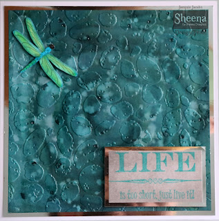 Make a banner out of Red Mirri card and cut more of the Red paper to fit inside the banner, ink the edge of the red paper as before, stamp onto this the Heartfelt Creations Heartfelt Wishes sentiment 'Happy Birthday' then adhere the red paper to the mirri card banner using gel glue, adhere the flat end of this inside the Burgundy die so the banner comes up and over the edge of the die. Adhere the two Regal Boarders & Pockets dies to the top and bottom of the card as seen using PVA glue then adhere the burgundy die with banner under the top die cut so you can still see the stamped Blazing Poppy Stems underneath.