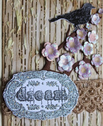 I got some Lace, inked it up with Vintage Photo and wrapped it round the bottom of the card. I placed the Dream frame on top of the Lace to the left of the card.