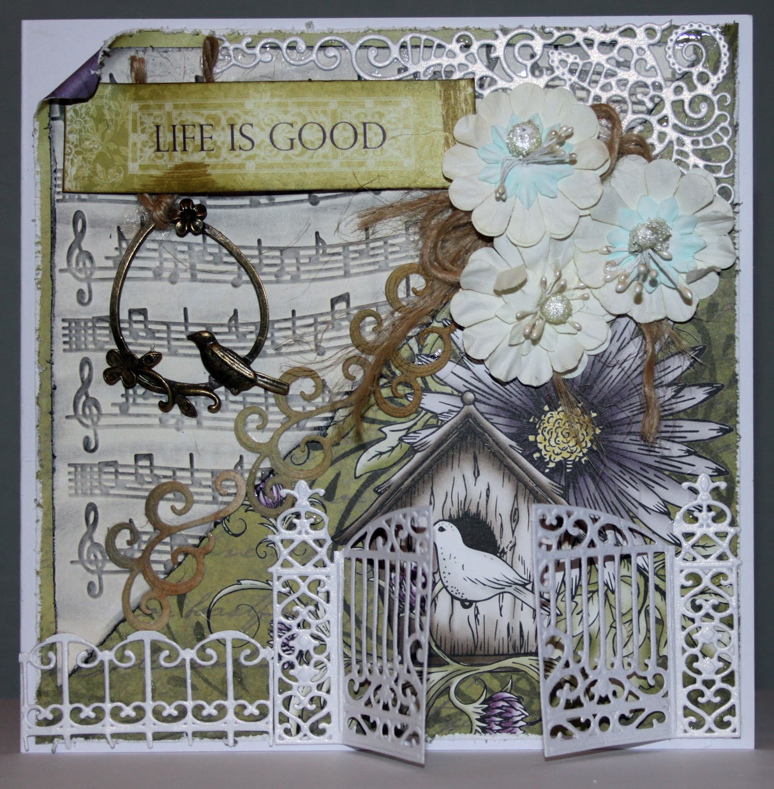 I had in my stash a brass metal bird on a perch that looked very similar to the bird in my image so I thought it would go well with my card, I tied a piece of Garden twine on it and attached it to my card over the musical notes.